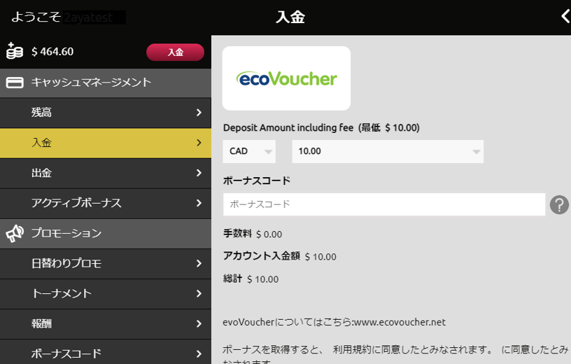 - カジノにログインして入金画面よりecoVoucherを選択しお持ちのエコバウチャーの通貨単位、金額を選択し「送金」をクリック。
